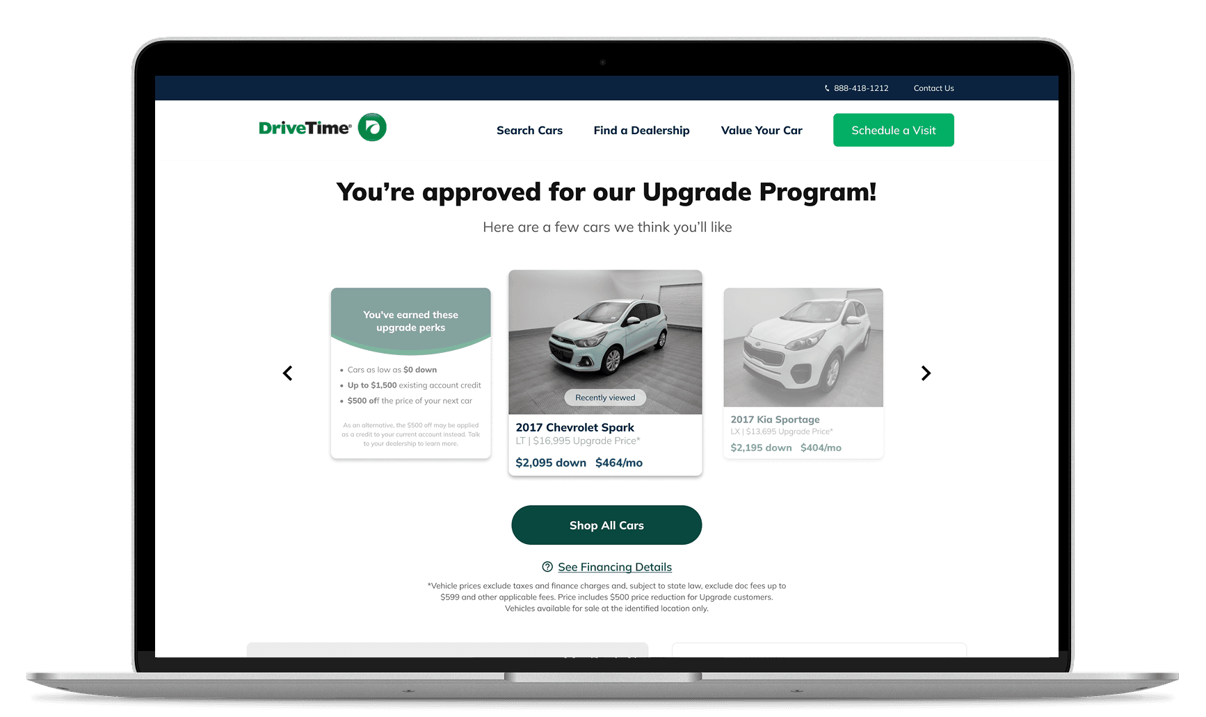 Introduce a vehicle carousel following the same logic as the finance App Cert carousel, showcasing the nicest available cars that match the customer’s minimum required down payment.Revamped Top Section